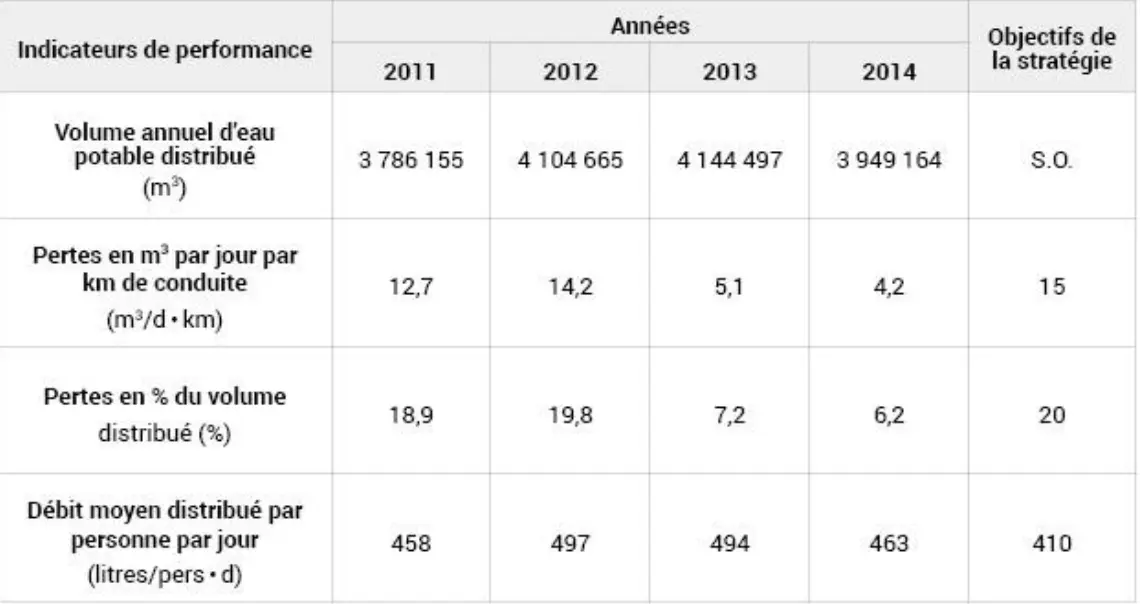 - Réduction des pertes d’eau par fuite à un maximum de 20 % du volume total d’eau produit et de 15 m3/jour par kilomètre de conduite.