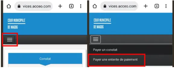 Une fois sur la plateforme de paiement, choisissez le menu déroulant en haute à gauche, puis l’option « Payer une entente de paiement » :